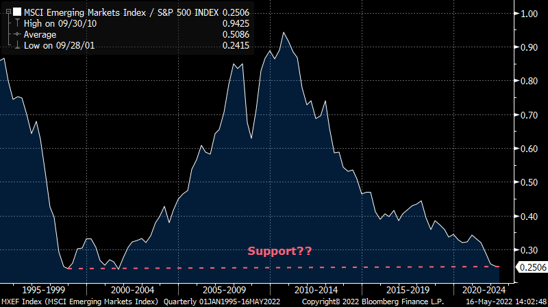 Below is a chart of the MSCI Emerging Markets Index compared to the S&P 500 Index, expressed as a ratio. When the line is rising, it means Emerging Markets are outperforming US stocks. When the line is falling, it means US stocks are outperforming EM stocks.