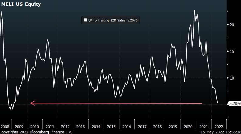Wall Street analysts project MELI to grow sales and gross profit 45% in 2022. In an economy that looks more sluggish by the day, hitting anywhere close to those numbers would qualify as “amazing.” Meanwhile, you can pickup MELI shares near the lowest Enterprise Value to Sales multiple since 2009.