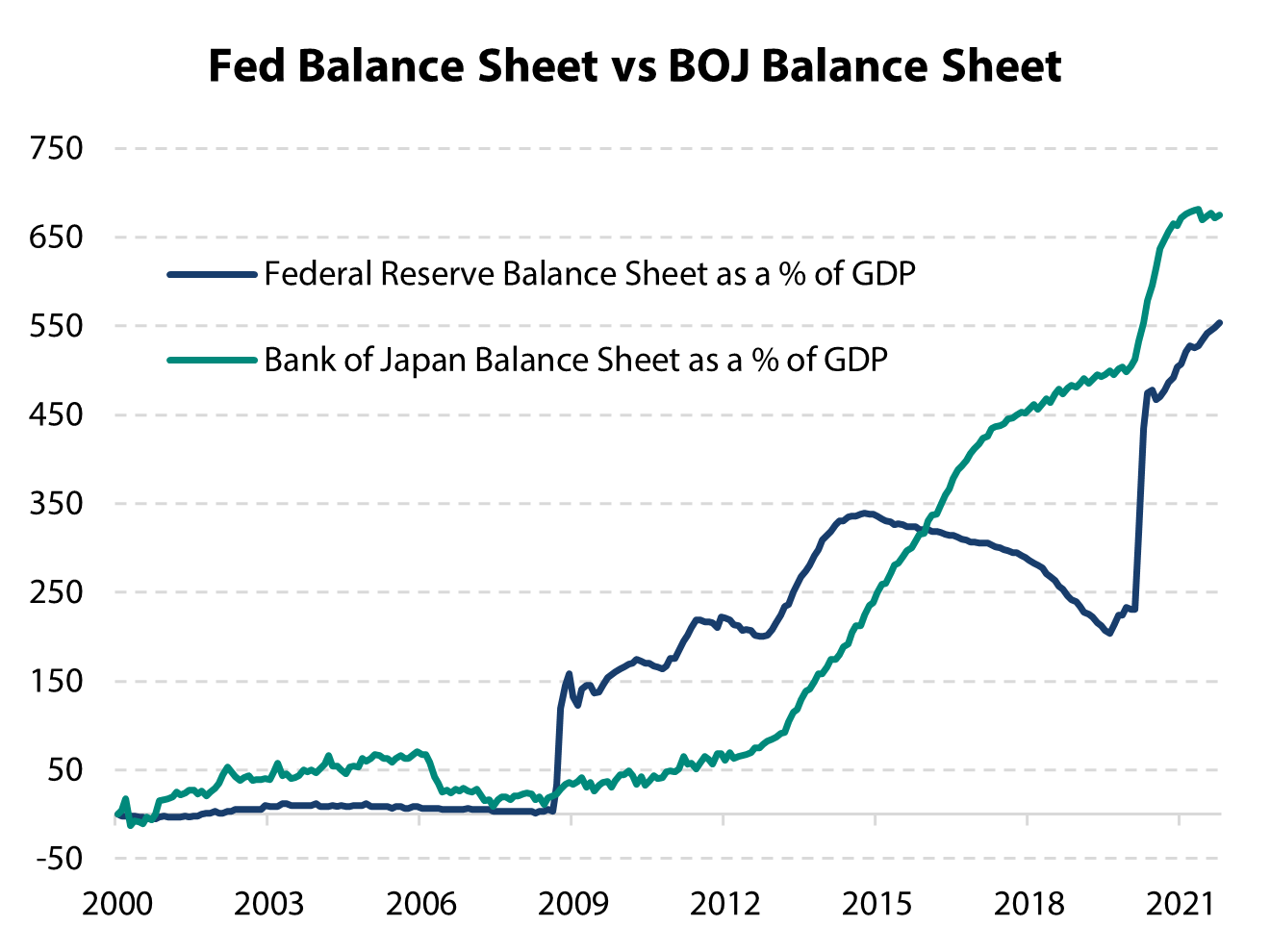 Since 2000, the Bank of Japan (BOJ) has expanded its balance sheet more aggressively than the Federal Reserve.