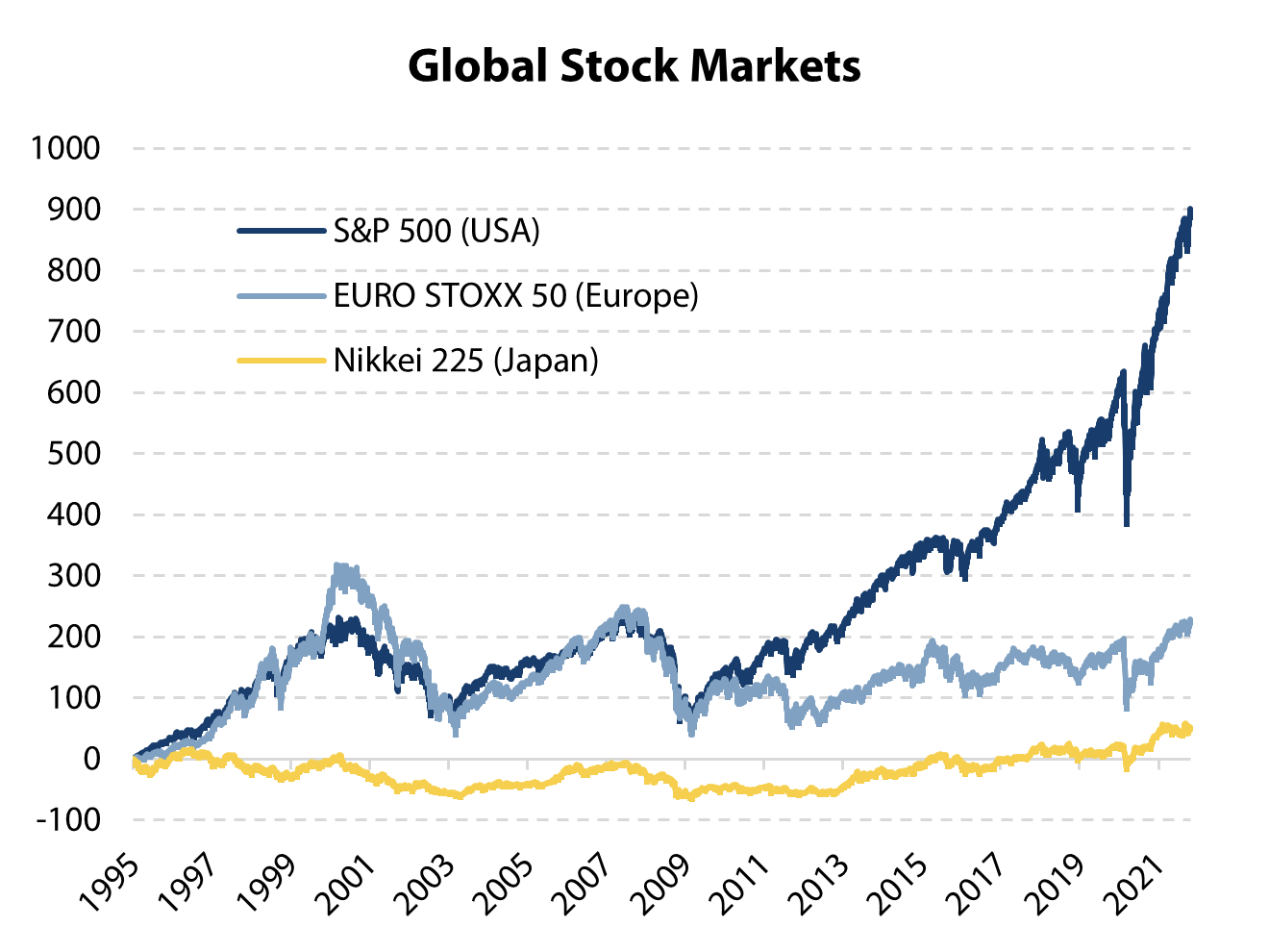 If QE is bullish for stocks, though, why has Japan’s stock market lagged so much? Japan has done more monetary intervention than any country in the developed world. Yet, the Japanese stock market has significantly trailed the US and Europe.
