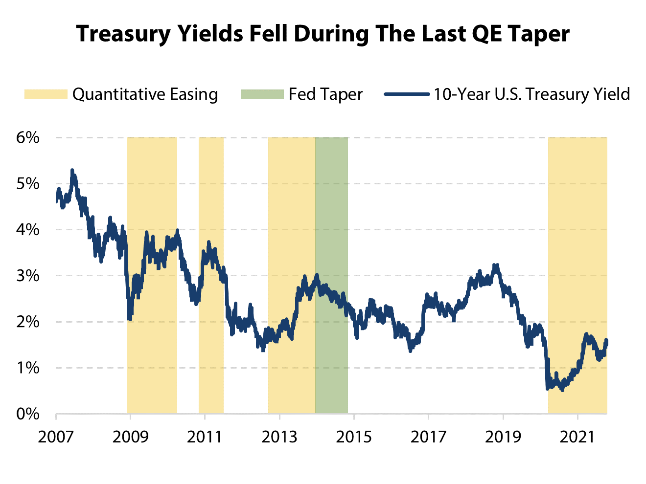 When the Fed buys bonds, the goal is to stimulate bond prices and suppress yields. Some worry QE tapering will cause interest rates to spike in a harmful way.