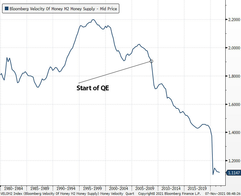 Since QE started in the US, banks have underperformed. Meanwhile, there has been a sharp drop in the velocity of money moving through the US financial system.