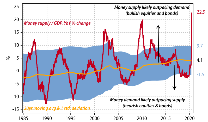 The Fed started expanding its balance sheet in the fourth quarter of 2019. Then, the amount of new money creation went parabolic in March. When money supply exceeds nominal GDP growth, as is presently the case, excess liquidity makes its way around the system, bidding up asset prices.