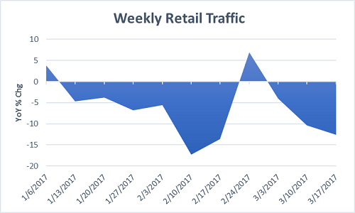 The main issue is that fewer people are physically shopping. In the week ending March 18, North American retail traffic fell 12.6%, consistent with the pattern most of the year.
