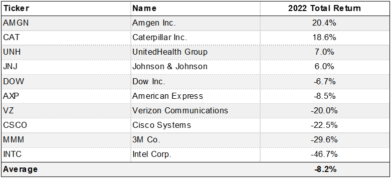 Last year, the Dobermans of the Dow averaged a total return of -8.2%. I consider that an OK relative return in a tough year. By comparison, the Dow Jones Industrial Average (DJIA) fell 6.9% in 2022, while the S&P 500 index lost -18.1% and the Nasdaq Composite declined -32.5%.