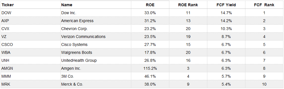 1) Rank the 30 Dow stocks by Return on Equity (ROE), keep the top 20.
