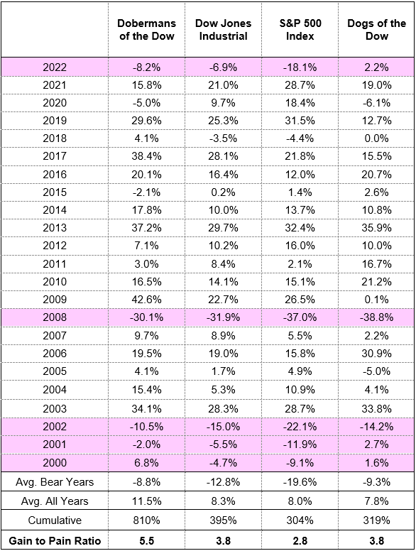 One of the things I like about the Dobermans of the Dow strategy is that it has done well in bull and bear markets. That’s important to me as an investor because bear markets are tough enough as is. Outperforming during volatile markets helps smooth out the investing journey.