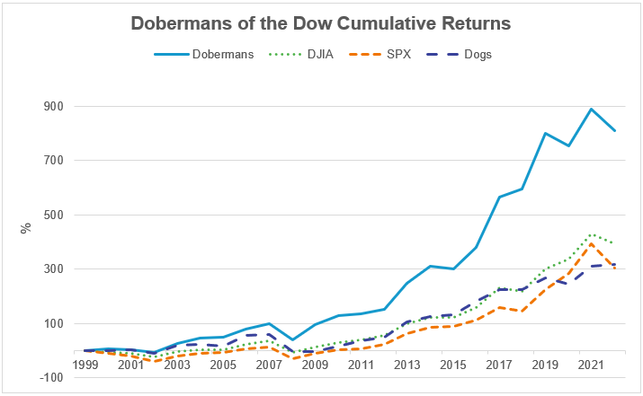 Historically, a hypothetical Dobermans of the Dow portfolio has outperformed the Dow Jones Industrial Average (DJIA) and the S&P 500 Index. Since 2000, the Dobermans portfolio rebalanced annually has generated a cumulative return of 810 percent, which is more than double the long-term performance of the Dow, S&P 500, and the Dogs of the Dow.