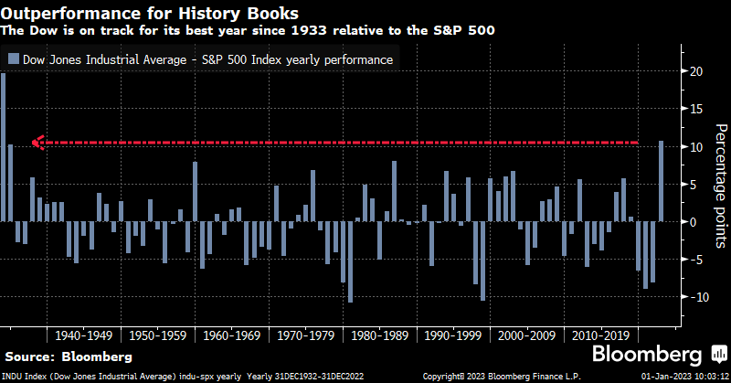 Interestingly, as financial conditions tightened in 2022, the Dow outperformed the S&P 500 by the widest margin since 1933.
