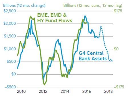 Risk assets across the board have been influenced by central banks policies. One example is reflected in the graph below, courtesy of Fidelity. It shows the projected path of the G4 Central Banks combined balance sheet in rate of change terms (blue line), overlaid against emerging market stocks and bonds (green line). If the correlation holds, it implies EM assets may face a bumpier ride.