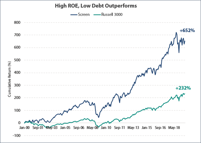 We can measure business quality by looking at profitability and leverage metrics. To help showcase the utility of such factors, let’s assume an investor only buys stocks from the Russell 3000 Index that rank: