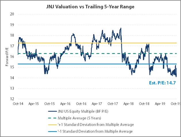 J&J shares trade at a forward P/E of 14.7. That’s a discount to the S&P 500, and is 1.5 sigma cheaper than the 5-year trend.