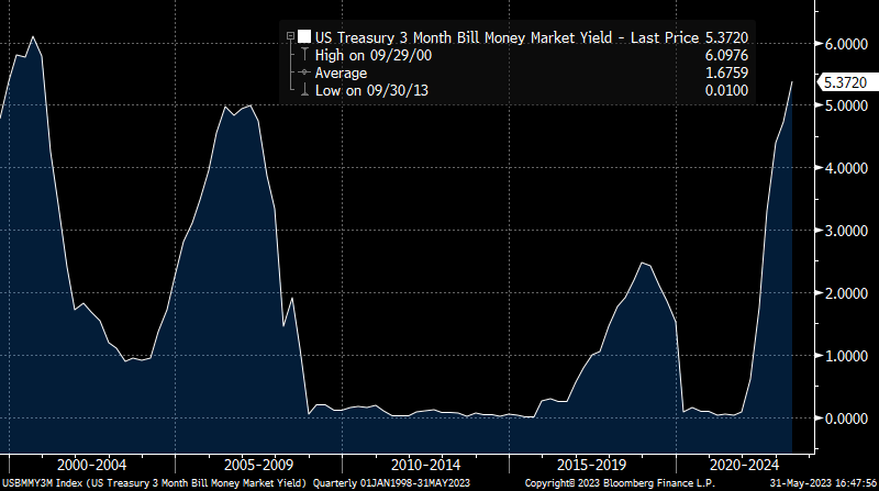 Money market yields are largely guided by the Federal Reserve’s policy actions. Over the last year, the Fed has been rapidly pushing short-term interest rates higher to combat inflation. 3-month treasury bill rates are a useful proxy for money market yields. As you can see in the chart below, the current T-bill rate is near the highest level in twenty years.