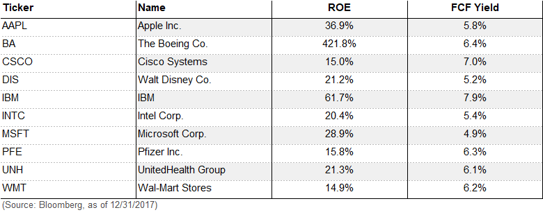 The Dobermans of the Dow is a better companion tool for investors, because it’s more dynamic. It starts by sorting Dow constituents by a quality metric (ROE). Then, among those higher quality names, it compares prices in a more universally applicable way (FCF yield).