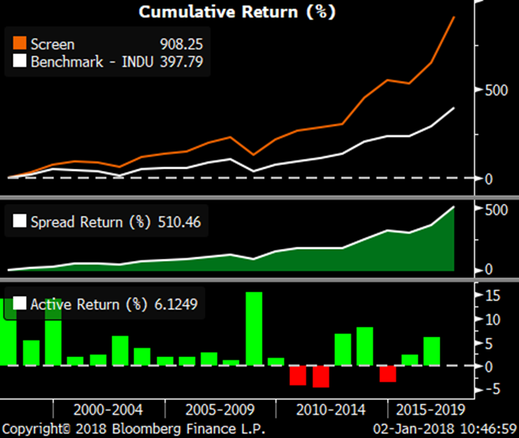 This sequential screening technique beat the Dow index in 17 of the last 20 years. Meanwhile, its cumulative total return of +908% blew away the benchmark.