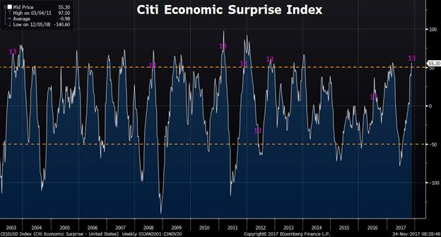 As money managers begin to think about where the best opportunities will be in the year ahead, some will sit on this year’s biggest winners until year-end purely for tax reasons. However, with the Economic Surprise Index primed for a reversal, conditions are also ripe for new narratives to form.