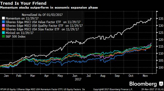 There’s a whiff of rotation in the air. On Wednesday, the mighty FANG stocks erased $60 billion in combined market value by the time the closing bell rang—their worst day on record. Maybe tax reform progress is prompting money to move toward groups poised to benefit the most from lower corporate taxes (tech isn’t one of them). Or, maybe the rubber band has simply stretched too far on the momentum factor’s outperformance. Since the beginning of the year, momentum stocks like the FANGs have steamrolled other traditional factor groups (i.e. value, quality, low volatility, etc.). That won’t continue forever.