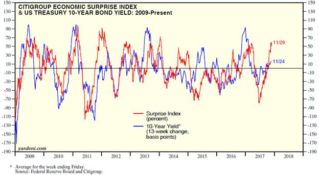 If we reasonably expect the Surprise Index to turn negative, we can also expect bond yields to fall (meaning bond prices should rise). Takeaway: if you have a balanced asset allocation including bonds, now may be a valuable time to tactically rebalance by pushing up your allocation there.