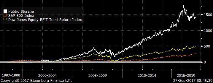 Over the last twenty years, PSA has averaged earnings growth of 9.4%, while sporting an above-average dividend yield of 3.8%. These stats compare favorably to the S&P 500’s 5.2% earnings growth rate and 2.0% average dividend yield (9/30/1997 – 6/30/2017, source: Bloomberg).