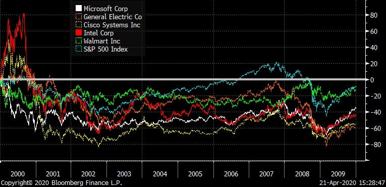 From 2000 - 2010, the S&P’s cumulative return was -9.1%. Pretty uninspiring. Yet it was far better than how the Fab 5 mega-caps fared. All of them lagged, with an average cumulative return of -41.7%.