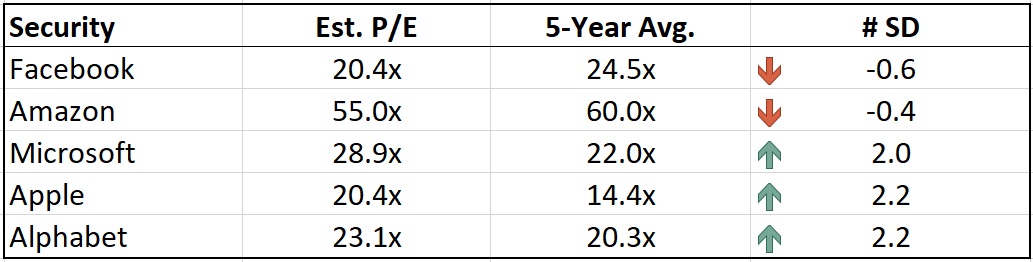 One concern that may point in that direction is valuation. Taking a peek at current valuations versus the five-year average, three of the stocks (Alphabet, Apple and Microsoft) trade two-standard deviations above their 5-year trend. How does that make any sense at all going into a recession?
