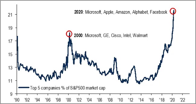 The last time the S&P was anywhere close to 20% concentrated in the top five names was in 2000, when Microsoft, GE, Cisco, Intel and Wal-Mart were at the top of the heap.