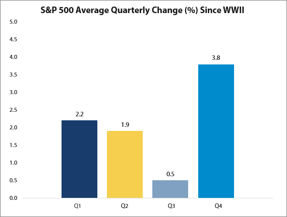 Post World War II, the S&P 500 has averaged a 3.8% return in Q4. That handily beats the first three quarters of the year.