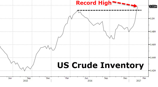 Unlike housing, the energy patch is awash in supply. Bloomberg data shows U.S. crude inventory at a record high: