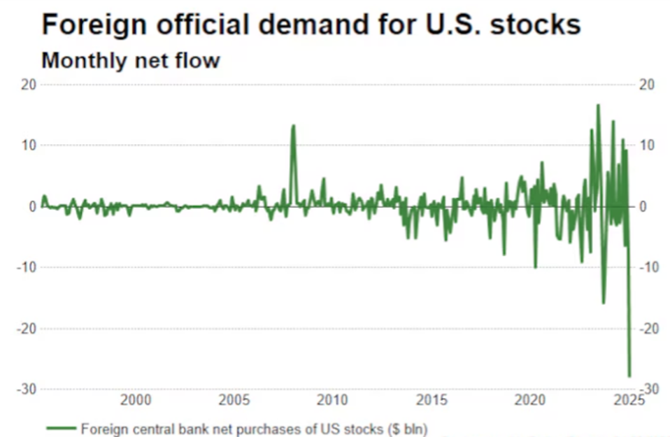 In January net purchases of US equities by foreign central banks plummeted $28 billion. This was a rather dramatic change in trend, as shown below.