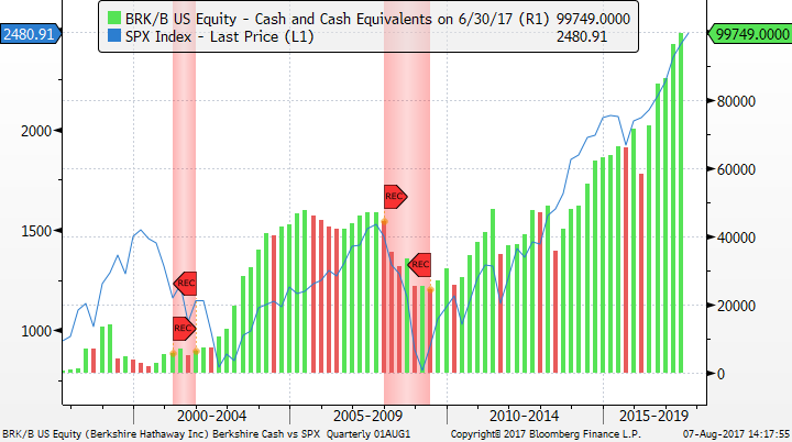 Berkshire’s cash has grown five quarters in a row (see green bars in chart below) and resides near $100 billion, while the S&P 500 (blue line) has steadily advanced over the same period, to an all-time high.