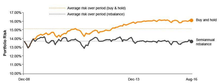 Buy and hold investors don’t necessarily maintain static risk levels, either. If you haven't rebalanced your portfolio over the last few years, you may be surprised at how much additional risk you are now taking on. The illustration below shows how a conventional diversified portfolio can see it’s risk profile drift higher over the course of a bull market (source: Fidelity).