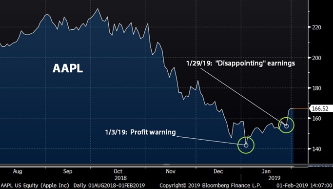Another example: Apple issued a profit warning after the market close on January 2nd. Investors scampered to the sidelines the following day, which also marked the recent bottom. Adding insult to injury, Apple shares rallied 6.8% after lackluster earnings were later released on January 29th.