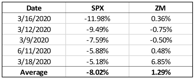 The purpose of a ‘hedge’ is to provide a positive return source when most positions in a portfolio do poorly. If we look at the five largest daily declines for the S&P 500 year-to-date, we see Zoom averaged a positive return.